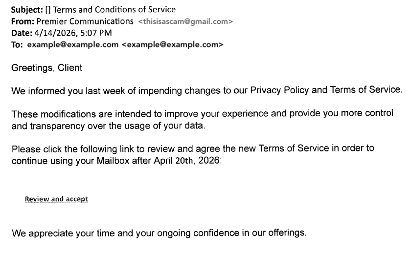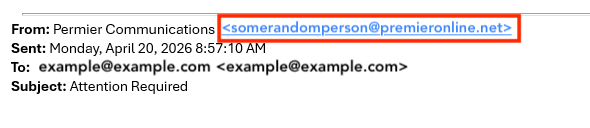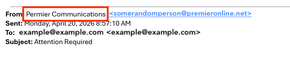 3. Odd looking email addresses—Look beyond just the name displayed. Even though it says, "Premier Communications," make sure that the email is legit.